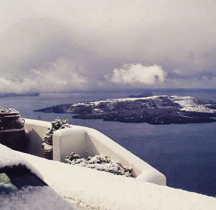 And yes, it does snow in Santorini as well although not often. It is such a beautiful sight to see a pristine veil of snow cover everything, even the volcano! It almost looks like caster sugar, does it not?